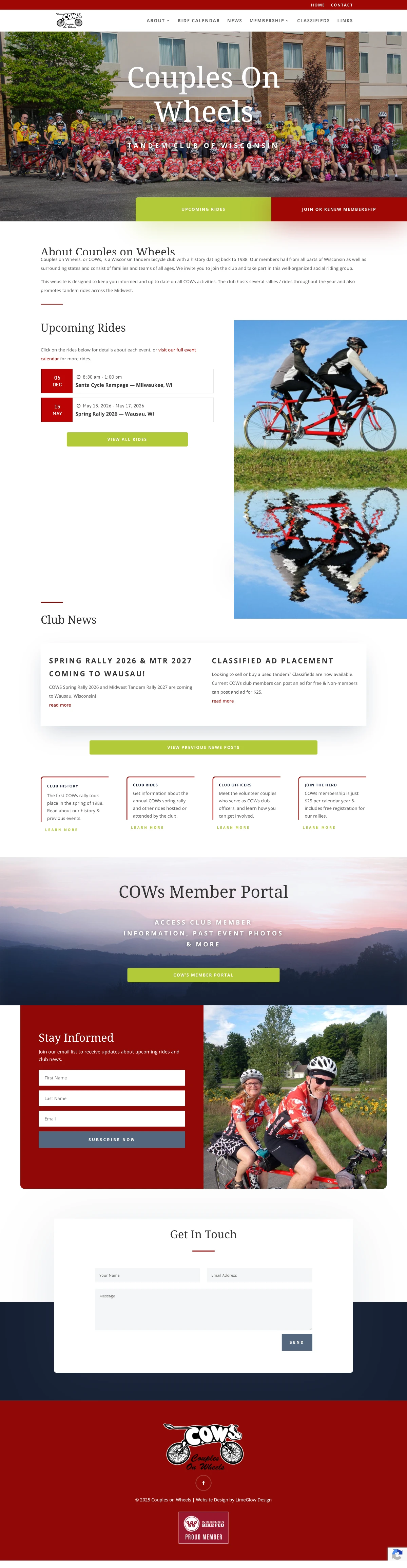 Couples on Wheels, or COWs, is a Wisconsin tandem bicycle club started in 1988. COWs hosts organized tandem biking events throughout the year and promotes tandem riding in the Midwest region.