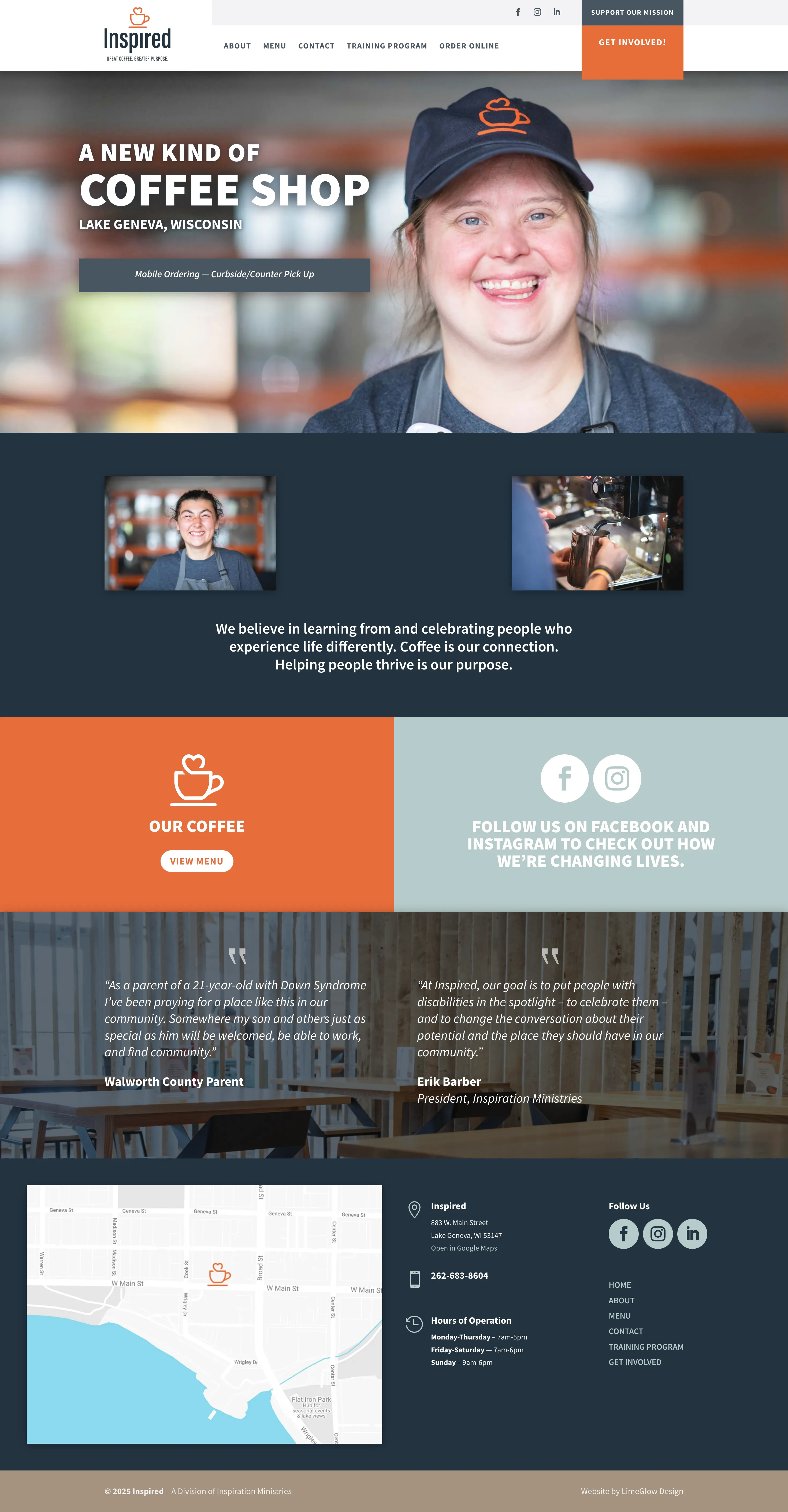 Inspired is a coffee shop in Lake Geneva, Wisconsin. Inspired has a wonderful purpose – empowering people with disabilities. Visit their website to read more about their mission (and, if you’re in the Lake Geneva area, be sure to stop by in-person to enjoy some great coffee)!