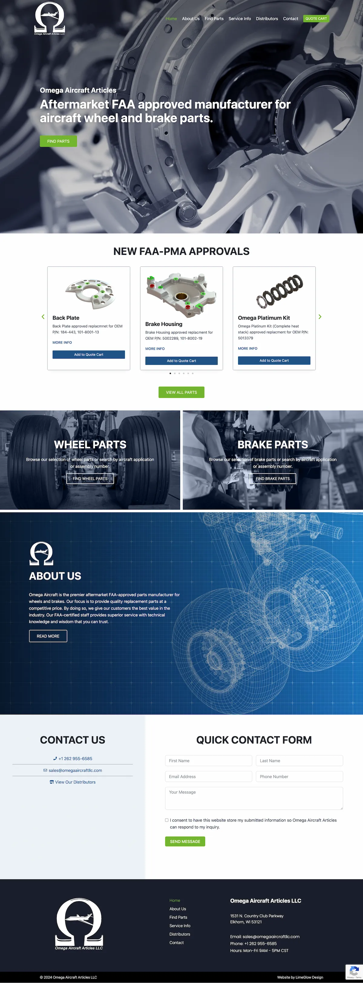 Omega chose LimeGlow to design and develop a new website for their company in 2023. The site showcases their catalog of aircraft parts and provides an easy way for customers to receive a quote or find a distributor.