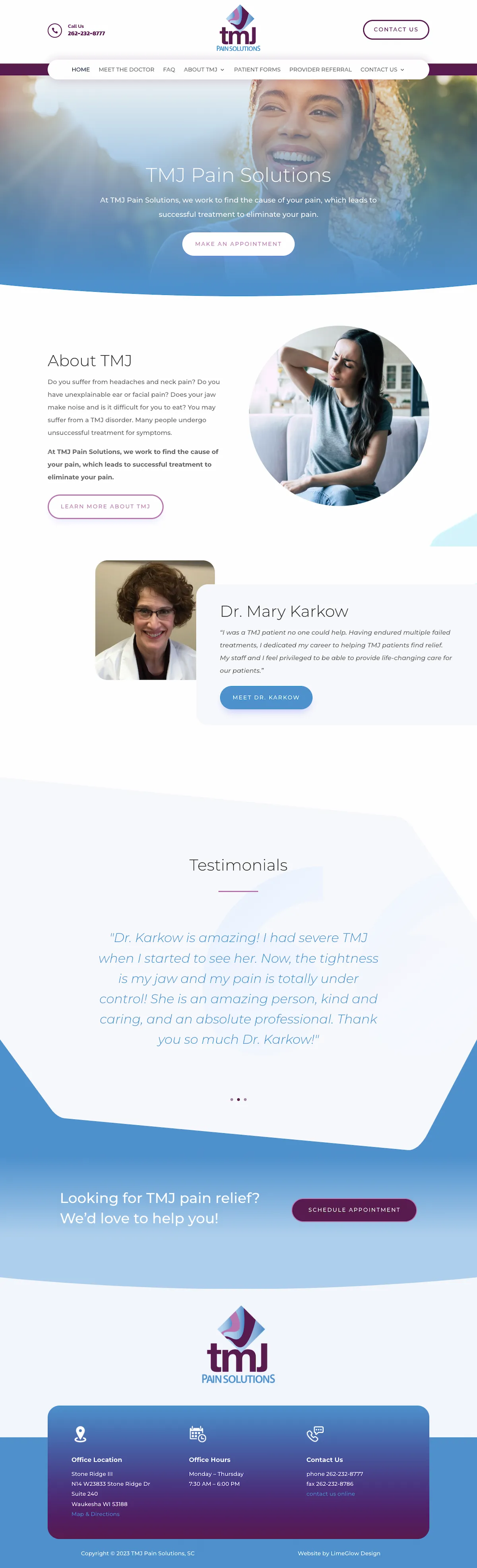 TMJ Pain Solutions selected LimeGlow to design and develop a website for their clinic in 2021. The site outlines their mission and gives details explaining TMJ symptoms and treatments.